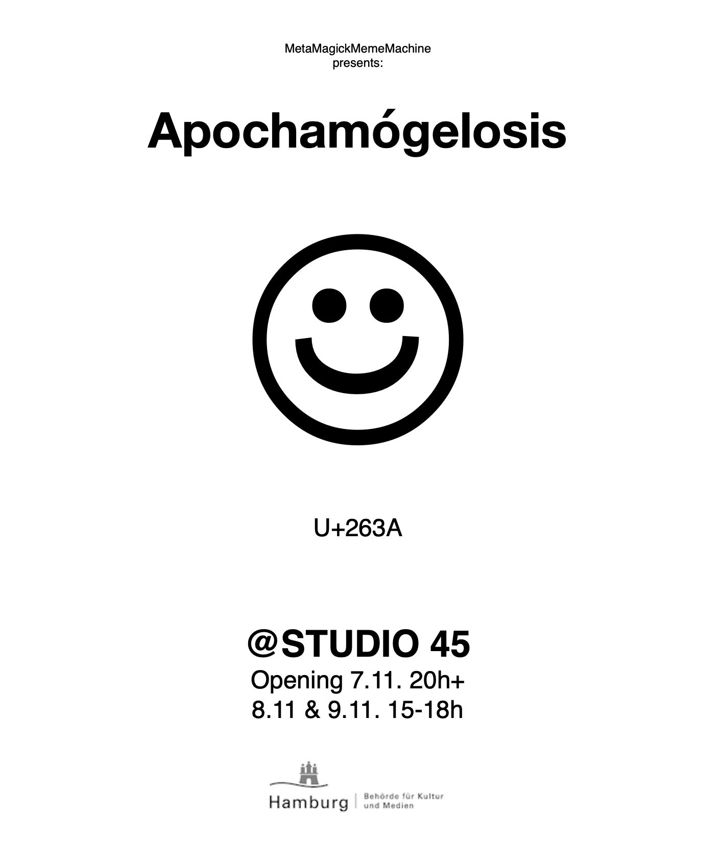 7. - 9.11.2025 Apochamógelosis is a fun-pun history of evolutionary tongue-in-cheek memes, detours and curiosities, personifying diverse cornystones of the eternal strive towards the light. Ancient watchers, hybrid-swarms, sono-scapes and accidental robo-crap chronologically culminate in permutations of the blissful state of smile. Through a whirling world constructed and assembled from the found, the horded and the transfigured, Apochamógelosis is an aleatoric kintsugi re-cycle-o-mania with a pareidolic twist - honoring one of the most archaic and timeless, yet contemporary symbols of them all. Eröffnung: Freitag, 7.11.2025, 20 Uhr Öffnungszeiten: Samstag, 8.11.2025, 15-18 Uhr Sonntag, 9.11.2025, 15-18 Uhr