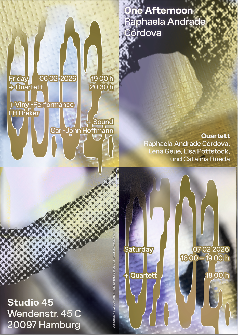 06.- 07.02.2026 The wings slowly fell silent, the light is warm, and the atmosphere sings. Exhibition Installation, sound, kinetics by Raphaela Andrade Córdova in quartet with Lena Geue, Lisa Pottstock, Catalina Rueda Sound Carl-John Hoffmann friday 6, Opening at 7 p.m., 8:30 p.m. Quartet + Carl-John Hoffmann, 9:30 p.m. Vinyl performance by FH Breker saturday 7, Open from 16p.m / 6 p.m. Quartet + Carl-John Hoffmann